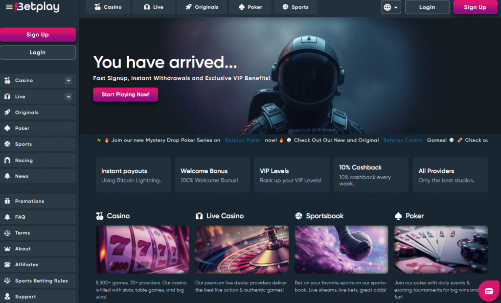 Betplay.io je moderní krypto kasino, které si získalo důvěru hráčů díky rychlým transakcím, široké nabídce her a důrazu na soukromí. Od svého vzniku v roce 2020 se etablovalo jako spolehlivá platforma pro hráče hledající bezpečné a pohodlné hraní. Intuitivní rozhraní a transparentní podmínky zajišťují příjemný zážitek, a to jak pro nováčky, tak pro zkušené hráče.