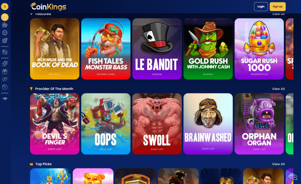 CoinKings nabízí širokou škálu her od renomovaných poskytovatelů jako NetEnt, Pragmatic Play, Evolution Gaming a Microgaming. Mezi oblíbené tituly patří automaty jako Starburst, Gonzo’s Quest a Book of Dead. Pro fanoušky stolních her je k dispozici blackjack, ruleta, baccarat a další. Live casino nabízí interakci s živými krupiéry ve hrách jako Monopoly Big Baller, Crazy Time a Deal or No Deal.