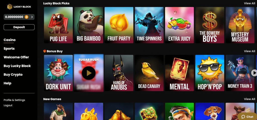 Lucky Block Casino nabízí širokou škálu her od renomovaných poskytovatelů jako Pragmatic Play, NetEnt, Microgaming a Evolution Gaming. Mezi oblíbené tituly patří automaty jako Dork Unit, Extra Juicy a Wild Yield. Pro fanoušky stolních her je k dispozici blackjack, ruleta, baccarat a další. Live casino nabízí interakci s živými krupiéry ve hrách jako Monopoly Big Baller, Crazy Time a Deal or No Deal.