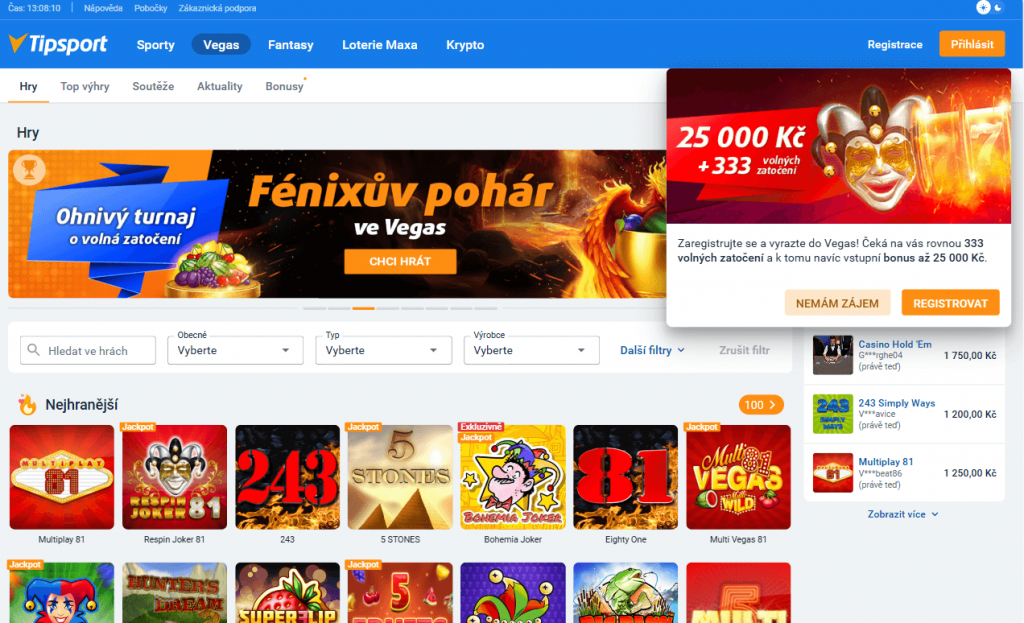 • Pravidelné promoakce: Tipsport Vegas pravidelně pořádá různé promoakce, jako jsou turnaje, cashbacky a další speciální nabídky pro stálé hráče.